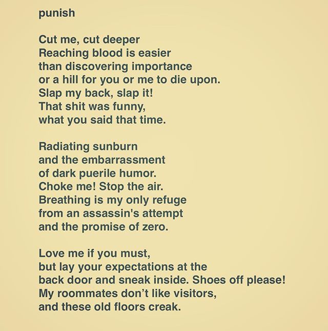 Punish . . . . . #globalpoetcult #gpoets #gvillagepoetry #instapoem #instapoet #instapoetry #ncpoetry #ncpoetrysociety #novicepoetry #cut #poem #roommates #poet #poetrycommunity #poetryisnotdead #poetrypunch #poets #poetsofig #poetsofinstagram #spilledink #spokenword #punishment #wordporn #writer #writers #writerscommunity #writersofig #writersofinstagram #writing #writingcommunity