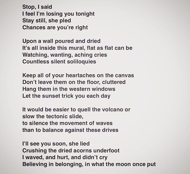 Stop . . . . . Stop, I said I feel I’m losing you tonight Stay still, she pled Chances are you’re right Upon a wall poured and dried It’s all inside this mural, flat as flat can be Watching, wanting, aching cries Countless silent soliloquies Keep all of your heartaches on the canvas Don’t leave them on the floor, cluttered Hang them in the western windows Let the sunset trick you each day It would be easier to quell the volcano or slow the tectonic slide, to silence the movement of waves than to balance against these drives I’ll see you soon, she lied Crushing the dried acorns underfoot I waved, and hurt, and didn’t cry Believing in belonging, in what the moon once put. . #poem #poet #poetsofinstagram #writersofinstagram #writing #poetsofig #writer #poetrycommunity #poems #wordporn #writersofig #words #spilledink #instapoet #poets #creativewriting #instapoem #writers #writerscommunity #instapoetry #writingcommunity #spokenword #poetryisnotdead #stop #mural #sunset #soliloquy View on Instagram https://ift.tt/2Hdb1uc