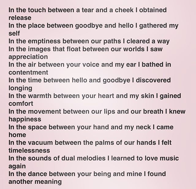 In . . . . . In the touch between a tear and a cheek I obtained release In the place between goodbye and hello I gathered my self In the emptiness between our paths I cleared a way In the images that float between our worlds I saw appreciation In the air between your voice and my ear I bathed in contentment In the time between hello and goodbye I discovered longing In the warmth between your heart and my skin I gained comfort In the movement between our lips and our breath I knew happiness In the space between your hand and my neck I came home In the vacuum between the palms of our hands I felt timelessness In the sounds of dual melodies I learned to love music again In the dance between your being and mine I found another meaning. . #poem #poet #poetsofinstagram #writersofinstagram #writing #poetsofig #writer #poetrycommunity #poems #wordporn #writersofig #words #spilledink #instapoet #poets #creativewriting #instapoem #writers #writerscommunity #instapoetry #writingcommunity #spokenword #poetryisnotdead #in #place #space #time #sound #voice #lips View on Instagram https://ift.tt/2Hb6ZT8