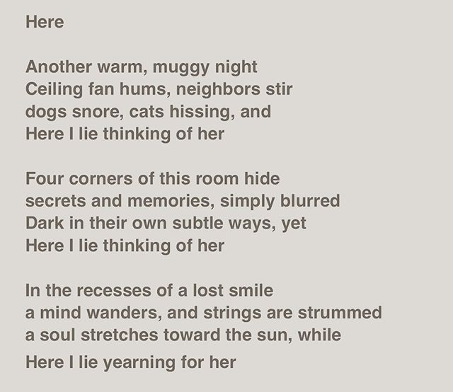 Here . . . . . Here Another warm, muggy night Ceiling fan hums, neighbors stir dogs snore, cats hissing, and Here I lie thinking of her Four corners of this room hide secrets and memories, simply blurred Dark in their own subtle ways, yet Here I lie thinking of her In the recesses of a lost smile a mind wanders, and strings are strummed a soul stretches toward the sun, while Here I lie yearning for her #poem #poet #poetsofinstagram #writersofinstagram #writing #poetsofig #writer #poetrycommunity #poems #wordporn #writersofig #words #spilledink #instapoet #poets #creativewriting #instapoem #writers #writerscommunity #instapoetry #writingcommunity #spokenword #poetryisnotdead #hereilie #thinking #yearning View on Instagram https://ift.tt/2TyBAiA