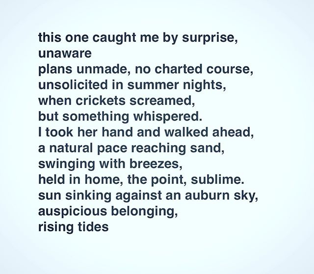 Rising tide . . . . . this one caught me by surprise, unaware plans unmade, no charted course, unsolicited in summer nights, when crickets screamed, but something whispered. I took her hand and walked ahead, a natural pace reaching sand, swinging with breezes, held in home, the point, sublime. sun sinking against an auburn sky, auspicious belonging, rising tides . #poem #poet #poetsofinstagram #writersofinstagram #writing #poetsofig #writer #poetrycommunity #poems #wordporn #writersofig #words #spilledink #instapoet #poets #creativewriting #instapoem #writers #writerscommunity #instapoetry #writingcommunity #spokenword #poetryisnotdead #risingtide #auspicious #belonging #surprise View on Instagram https://ift.tt/2LfLWBw