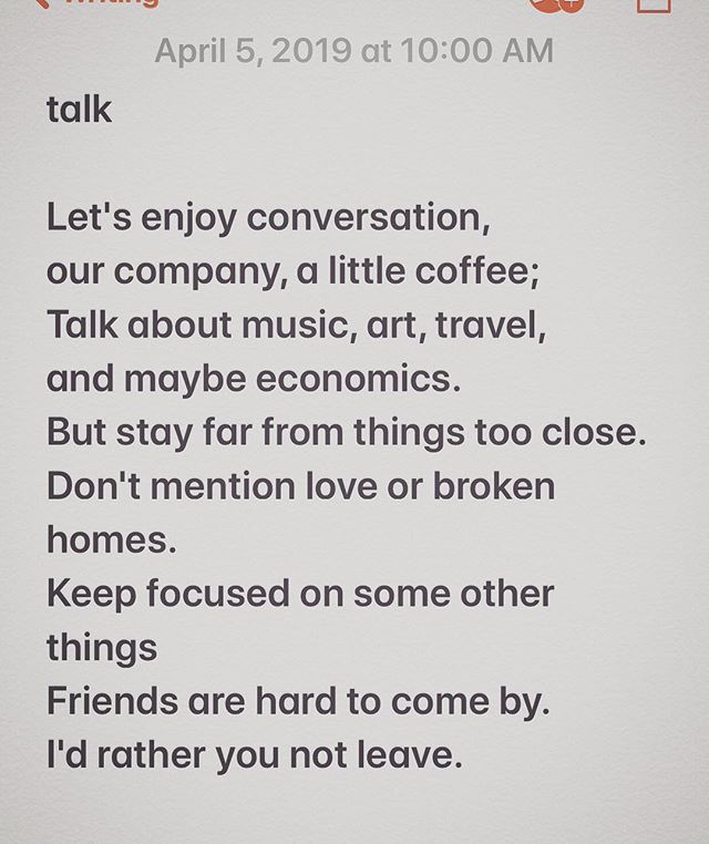Talk . . . . . #globalpoetcult #gpoets #gvillagepoetry #instapoem #instapoet #instapoetry #packpoetry #poem #poems #poet #poetrycommunity #poetryisnotdead #poetrypunch #poets #poetsofig #poetsofinstagram #spilledink #spokenword #thehallofpoetry #wordporn #writer #writers #writerscommunity #writersofig #writersofinstagram #writing #writingcommunity #divorce #brokenhome #conversation View on Instagram http://bit.ly/2CTuspV